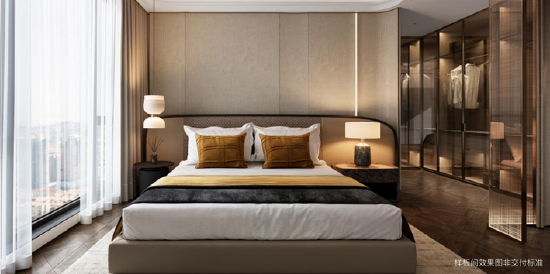 电梯厅打造专属过渡空间,归家动线从容有序;主卧总统套式布局,搭配独立步入式衣帽间与私享卫浴,女主从容整理衣物,男主拥有专属收纳区,私密与品质兼具。