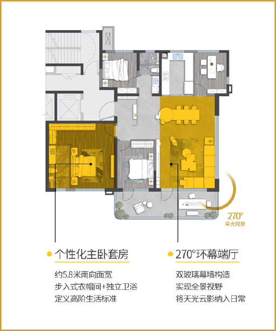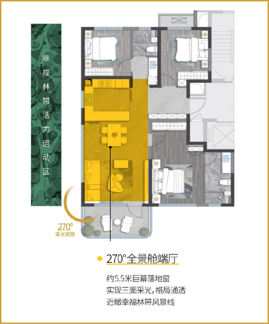 幸福晓棠建面约139㎡户型,以“270°端厅设计”为核心亮点,从归家仪式到休憩私域,从家庭互动到个体空间,全方位兑现轻改善家庭的“高阶生活想象”。