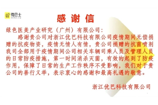绿色医美超1000万元专利防疫物资洁悠神抗菌喷雾已全部捐向西安新城区住房和城市建设局、无锡灵山慈善基金会、呼伦贝尔市委员会、广州宠回家动物救助基地、浙江优巴科技广大巴士司机职工、上海Magie动物保护基地、无锡金匮老年休养院等多地方派发。