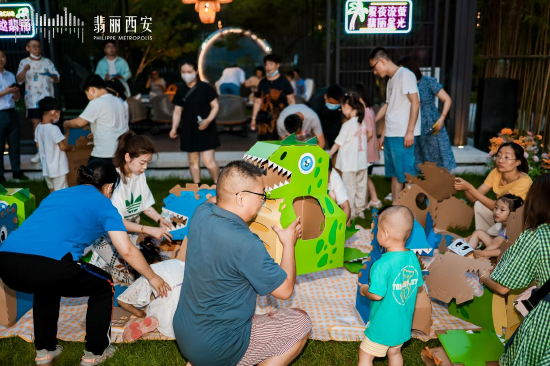 活动现场以实景园林为舞台,数千只翩跹起舞的萤火虫,让人仿佛踏入一场奇异美妙的梦境。而一顿丰盛的烧烤夜宴作为开幕信号,营造出活色生香的美好氛围。除了在置业顾问陪同解说下游览实体样板间,翡丽西安还为来访客户准备了纸壳恐龙DIY等亲子协同探趣游戏环节,让现场欢声笑语不断。
