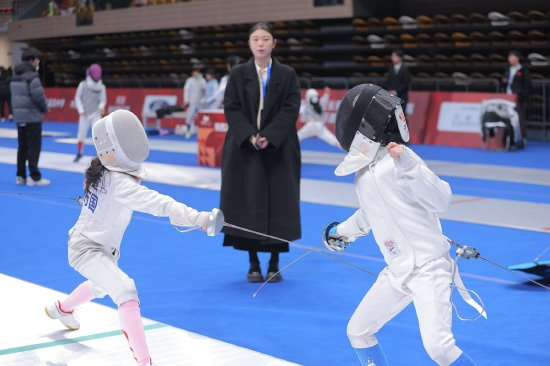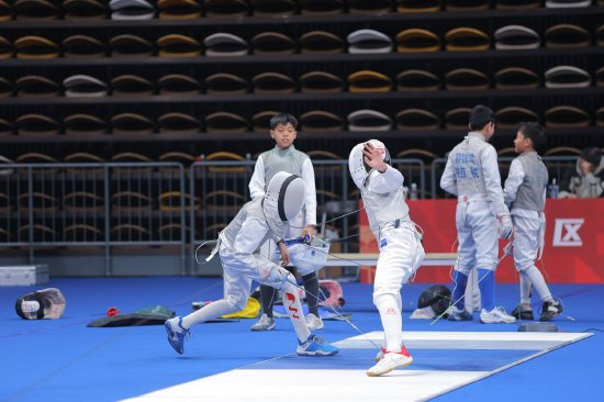 青少年组比赛分为花剑、重剑、佩剑三个剑种,按照参赛选手性别、年龄设有U8、U10、U12、U14、公开组(15-18岁)5个组别的个人赛,共计产生29枚金牌。一大早,寒冷的天气挡不住选手们摩拳擦掌的渴望比赛的心情剑道上,选手们剑尖相向,身姿矫健,或向前移动发起进攻、或后退移动压剑还击,每一次交锋都充满了紧张与刺激。