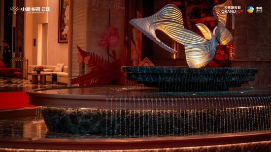 穹顶之下,艺术装置以凤凰振翅之姿舒展一羽翼的弧线凝练着翱翔千仞的动势,金属与光影交织出“羽衣翩跹“的灵动韵律,寓意凤凰来仪,为家族镌刻尊贵与祥和的底色。“云庭”则呼应建筑场景,暗含平步青云,步步高升,让每一次出入皆怀进取之心。