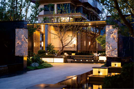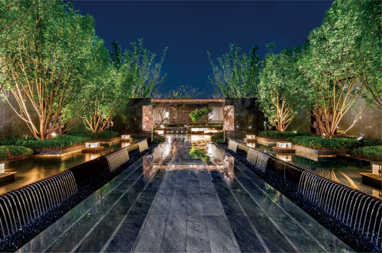 约22米礼序中轴一步一景,归家仪式感拉满;超约180㎡安漫风廊架会客厅,配约30㎡U型临水下沉卡座,约410㎡镜面水环绕,休闲会客尽显格调;
