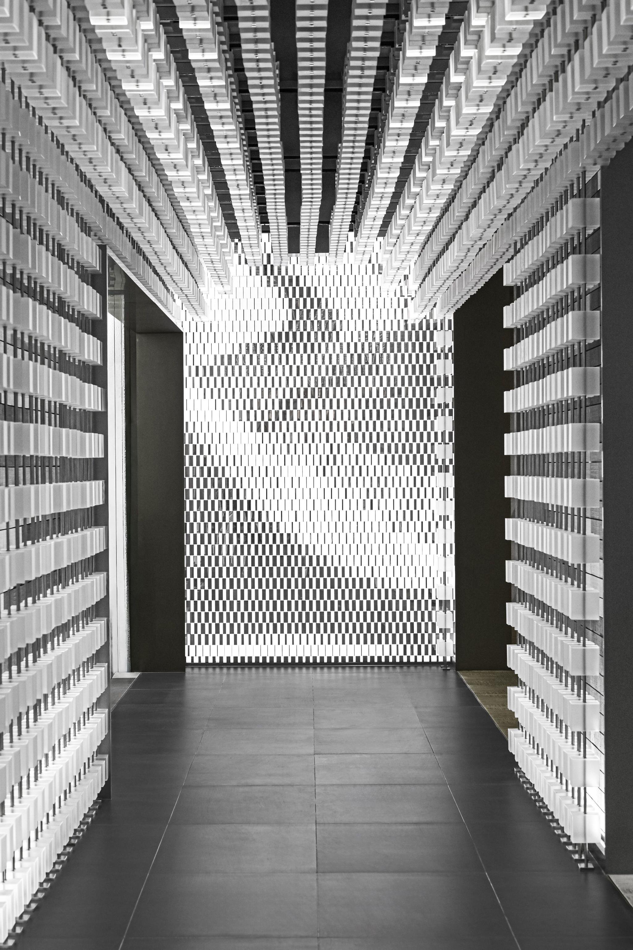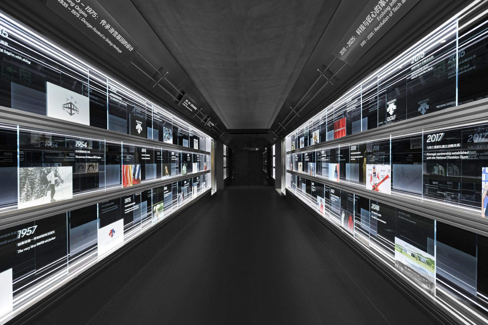步入室内,店铺空间进一步围绕“古—今—未”的脉络铺陈。拱形矩阵构筑的时空隧道徐徐延展,宛若古城门洞,成为连接古今与未来的入口。西安文化地标钟楼、大雁塔、秦岭山脉与雪道轨迹在此交叠融合,编织出关于西安城市文化与迪桑特冰雪基因专属的空间叙事。