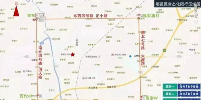 二、限行区域:以鄠邑区城区为中心,向东扩展至南北七号路(大庞路)以西,向南扩展至东西六号路(余禹路)以北,向西扩展至南北四号路(渭天路)以东,向北扩展至东西四号路(正小路)以南。
