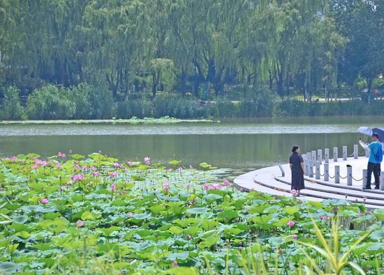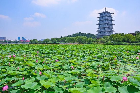 6月17日,西安世博园荷花盛开,与长安塔交相辉映,荷香袭人,美不胜收。
