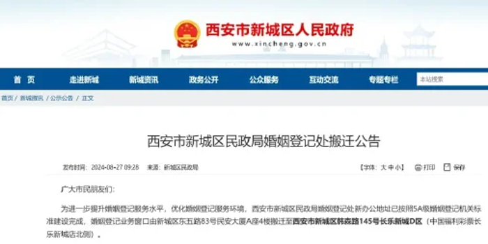 新城区民政局发布搬迁公告 西安发布 08月29日 11:37 关注 确定不再关注此人吗 近日,西安市新城区民政局发布婚姻登记处搬迁公告。婚姻登记业务窗口搬迁至西安市新城区韩森路145号长乐新城D区(中国福利彩票长乐新城店北侧)。(西安市新城区官网) 分享文章到:
