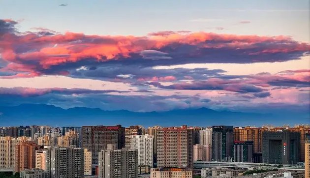 7月24日,日出时分,西安的天空铺满绚丽红霞,与城市建筑、秦岭山脉共同绘就一幅令人心旷神怡的壮美画卷。
