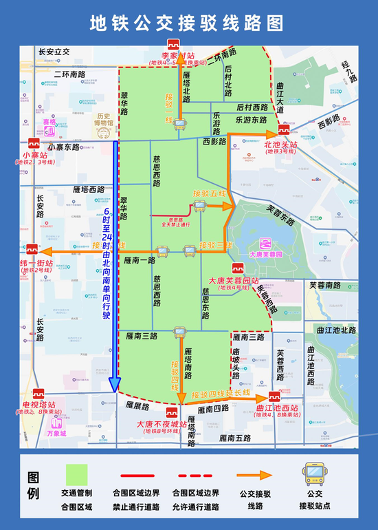 假日期间,大雁塔、大唐不夜城景区等周边区域将出现大车流、大客流,请广大市民游客提前做好出行规划,避开旅游高峰,尽量选择地铁、公交等公共交通方式出行,地铁2、3、4、8号线将根据线网客流情况动态调整发车频次及进出站流线。高德、百度、腾讯地图等导航软件将同步发布出行引导和路线规划信息。西安交警微博、微信公众号,西安地铁、西安公交微信公众号将实时公布景区及周边交通出行信息。雁塔区政府、曲江新区管委会将配套出台机动车出行服务措施,全面保障管控区内市民群众正常生产生活出行需求,请广大市民关注属地街办、社区发布的相关信息。公安机关交通管理部门也将根据道路交通实际情况,适时调整景区及周边道路交通管理措施。