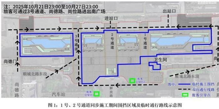 在此期间的临时通行路线为2025年10月21日23:00至10月27日23:00(1号、2号通道双封闭阶段):旅客可通过3号通道、尚德路、尚俭路进出南广场;2025年10月27日23:00至11月20日23:00(仅2号通道封闭阶段):旅客可通过1号通道、3号通道、尚德路、尚俭路进出南广场。