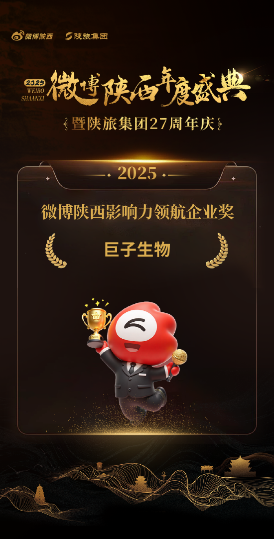 在当下竞争激烈的商业环境中,品牌影响力已成为企业发展的关键驱动力,它不仅是企业推广产品和服务的手段,更是塑造企业形象、建立客户忠诚度、拓展市场份额的重要战略。本次微博陕西年度盛典从创新力、竞争力等数个核心维度综合评选出了一系列陕西年度优秀企业,通过优秀企业的引领和示范带头作用,驱动更多企业参与其中,推动陕西各行业繁荣发展。本次微博盛典上重磅揭晓了2025微博陕西影响力领航企业奖榜单,巨子生物凭借出色的成绩荣获2025微博陕西影响力领航企业奖。