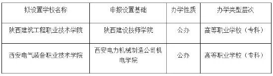 根据《中华人民共和国高等教育法》《高等职业学校设置标准(暂行)》《教育部关于“十四五”时期高等学校设置工作的意见》等有关规定,经陕西省高等学校设置评议委员会考察评议,省教育厅厅务会议审议,拟申报2个高等学校设置事项。现予以公示,接受社会监督。